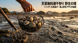 天草で無料潮干狩りを楽しむなら、管理場にはない「野生の理」を知るのが近道です。天草の複雑な地質が生むアサリの密集地(パッチ)の探し方や、アカエイ回避術、硬い底質を抜くプロの道具を徹底解説。無料潮干狩りだからこそ味わえる、放流物とは別格の厚い殻と濃厚な旨味を堪能しましょう。