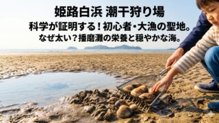 姫路白浜 潮干狩り場なら初心者も大漁!播磨灘の栄養で育つ太いアサリの秘密と忍者熊手の必勝法を解説。2026年の料金や持ち物、貝毒・日焼け対策まで網羅した姫路白浜 潮干狩り場の決定版ガイドです。家島諸島が守る穏やかな波の白浜で、家族の最高の思い出を収穫しましょう。