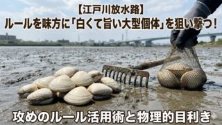 江戸川放水路の潮干狩りルールを徹底解説!殻長制限や熊手の幅20cm制限は、実は「旨い貝」を確実に獲るための科学的ヒントです。潮位10cmの黄金法則や泥の酸化還元電位など、ガチ勢の視点で江戸川放水路の潮干狩りルールを味方にする攻略法を伝授。家族で最高の一日を過ごしましょう。