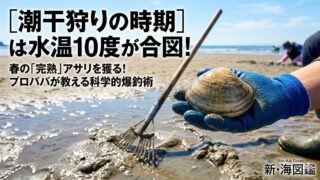 潮干狩り完全攻略 潮干狩りの時期は水温10度が合図!大潮の昼にアサリを獲る全技術 潮干狩りの時期はいつ?アサリが砂の表面に浮上する水温10度の法則や、春の日中に潮が大きく引く大潮のメカニズムをプロが科学的に解説します。潮干狩りの時期を逃さず、産卵直前の最も旨い個体を獲るための探索術や砂抜きの裏技まで網羅。家族で最高の週末を過ごすための決定版ガイドです。 2026.04.08 潮干狩り完全攻略