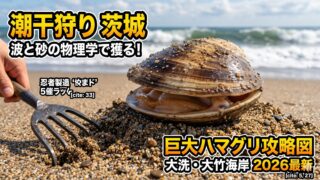 茨城の潮干狩り2026年最新版!大洗や大竹海岸で巨大ハマグリを獲るには「波と砂の物理」を知るのが近道です。駐車場5000台のキャパや放流情報、忍者クマデ等の必須道具、離岸流対策まで管理人のヒデが徹底解説。茨城の潮干狩りで家族最高の思い出を作り、太平洋の恵みを堪能しましょう!