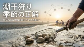 潮干狩りの季節は単なる春のレジャーではありません。1月から12月まで、月と太陽が作る潮汐のバイオリズムを知れば、アサリ攻略の精度は劇的に変わります。潮干狩りの季節ごとの海の表情や、旨味を3倍にする砂抜きの裏技まで、海のプロ・ヒデが51歳の親父目線で徹底解説します。