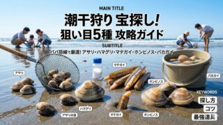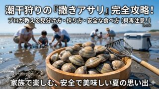 潮干狩りでハマグリを狙うなら、アサリとは違う「深層攻略」が鍵! 管理人のヒデが、5cm深く掘るコツや忍者熊手の活用法、バカガイとの見分け方を徹底解説します。 潮干狩りハマグリの漁業権や貝毒など安全情報も網羅。 家族で高級食材を仕留めて骨まで味わうための秘訣を伝授します。