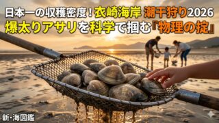 2026年の衣崎海岸での潮干狩りを完全攻略!日本一の収穫密度を誇る衣崎海岸の潮干狩りには、矢作川の栄養と底質の物理学が深く関わっています。最新の潮見表から、身がパンパンに詰まったアサリを獲るための忍者熊手活用術、車内での自動砂出しハックまで、海のガチ勢ヒデが徹底解説します。