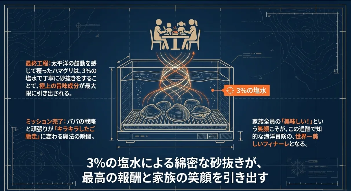 現地で汲んだ海水を使えば、1〜2時間程度の砂出しで十分に美味しく食べられることも多いです。泥質干潟の貝が半日以上かかるのと比べると、この「鮮度維持のショートカット」は、帰宅後にすぐ料理を楽しみたいお母さんたちにとっても嬉しいポイントですよね。