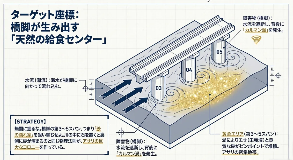 橋脚はただの柱ではなく、砂とエサを溜める「天然の仕掛け」です。特に岸から数えて3〜5番目の橋脚付近は、流れが絶妙に緩み、大粒のアサリが密集する物理的な定石ポイントになっています。