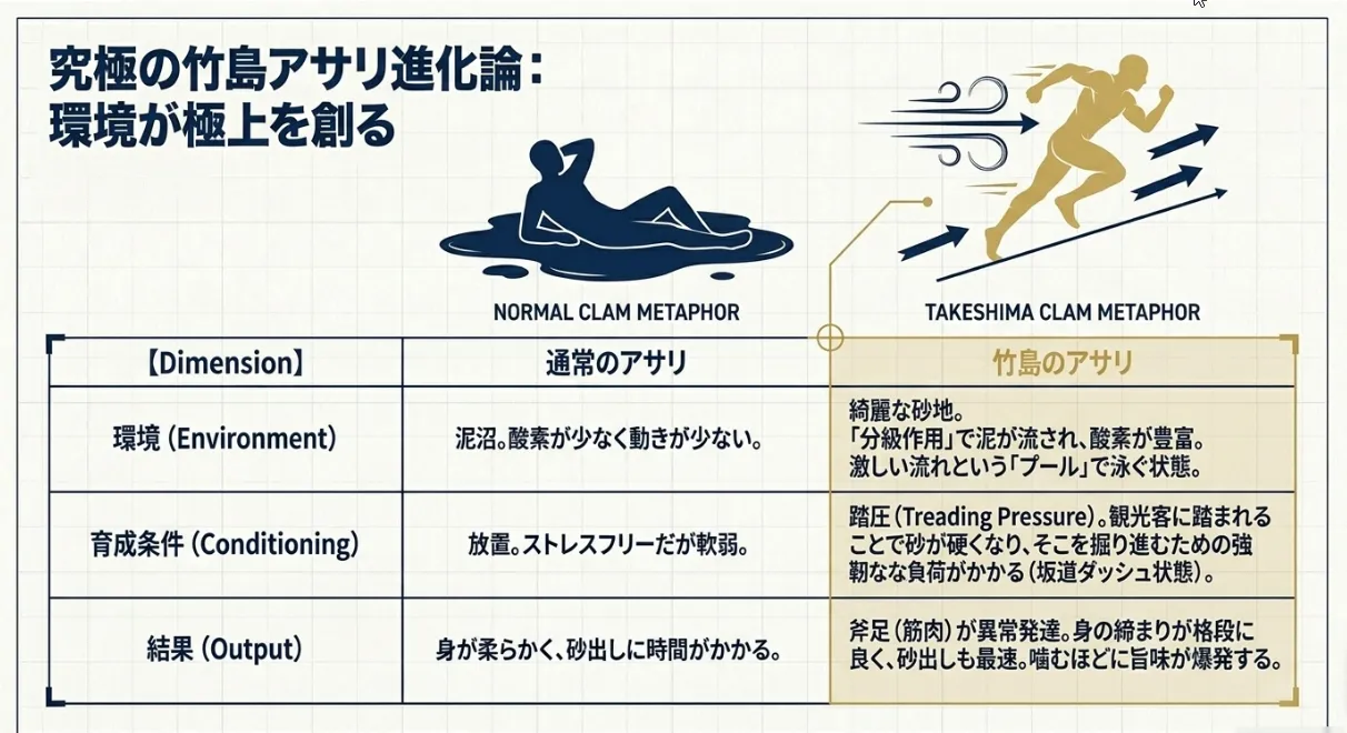 竹島のアサリを食べて「身の締まりが違う!」と感じるのは、この厳しい環境を生き抜いた証。硬い砂地で踏ん張ることで、旨味成分を蓄えた筋肉質でプリプリの身が出来上がるというわけですね。観光地ならではのストレスが、皮肉にも極上の食感を生み出しているんです。