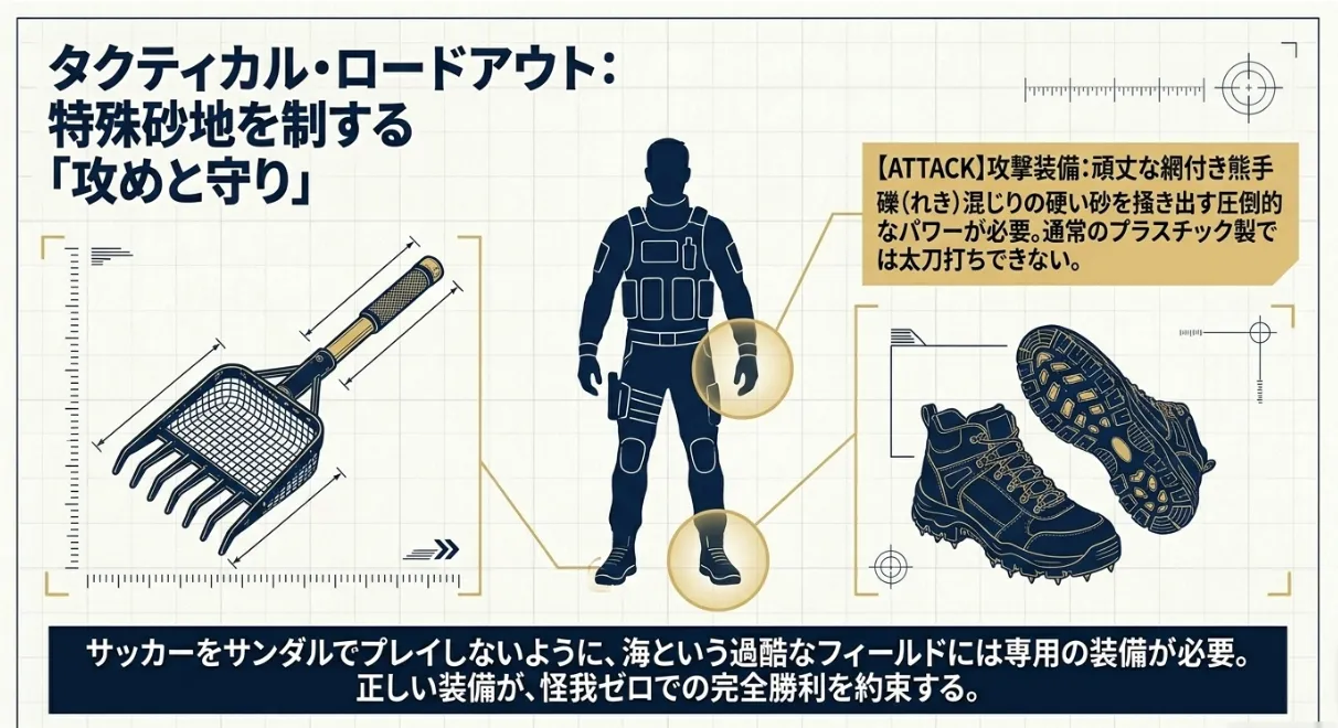 竹島の「中砂〜礫」という少し硬めの底質に合わせ、長い竹島橋(387m)の往復を楽にするための厳選アイテムをまとめました。装備を整えるだけで、疲労度は半分、収穫量は倍になりますよ。