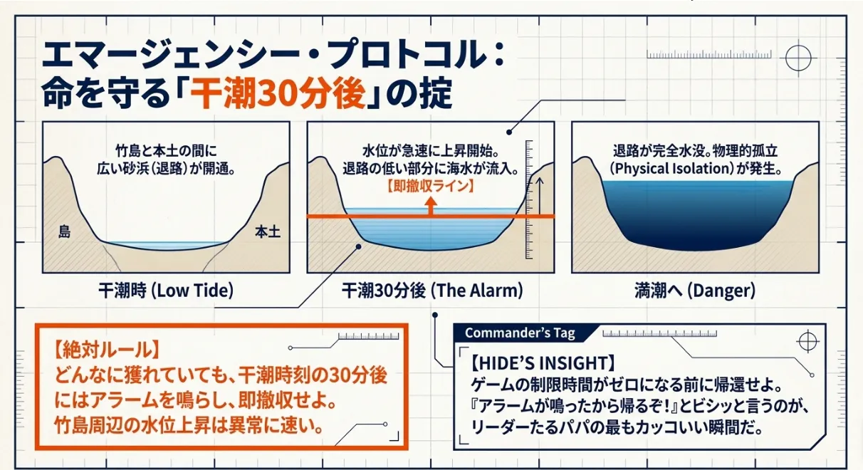 干潮30分後のアラームで上げ潮による物理的孤立を防ぐ