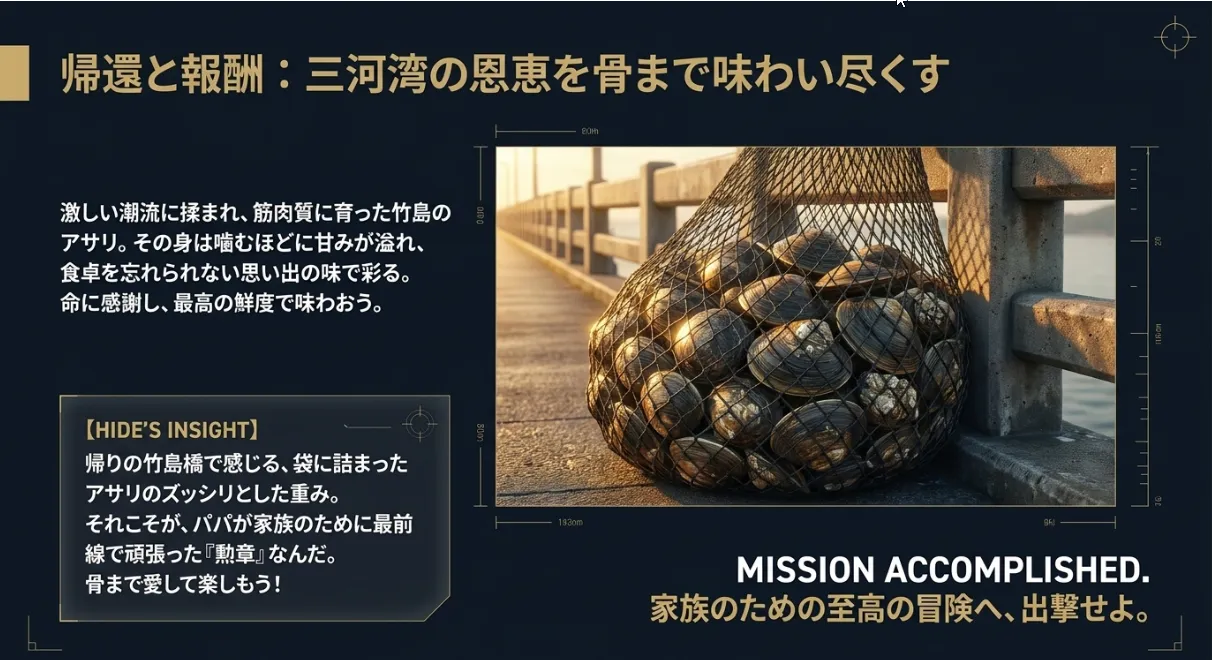 収穫したアサリを抱えて帰る竹島橋の上、少し重たくなったカゴの感触は、パパが家族のために頑張った勲章です。その夜の食卓で、磯の香りいっぱいの酒蒸しやお味噌汁を囲みながら、「あの橋の近くで獲ったんだよ」なんて話してあげてください。きっと、最高に美味しいはずですから。