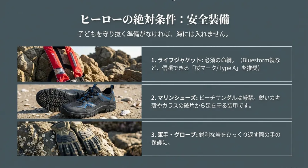 磯遊びの成功を左右するのは、実は「道具の準備」で8割決まると言っても過言ではありません。私がこれまでの経験から「これだけは絶対に外せない」と断言するアイテムを紹介します。