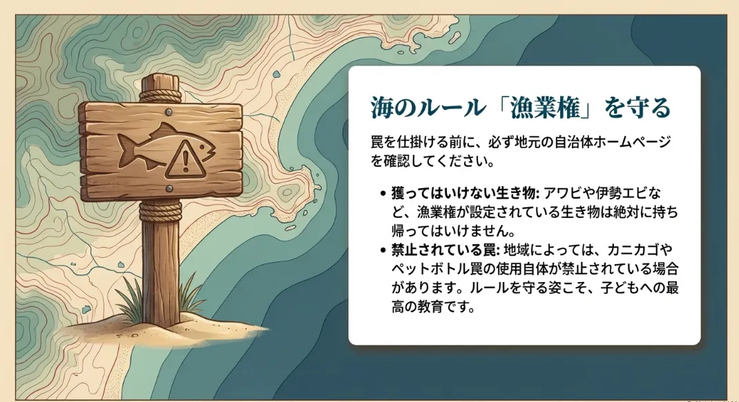 磯遊びで「罠」を楽しむとき、絶対に忘れてはいけないのが海のルールです。日本の海には「漁業権」という決まりがあり、たとえ遊びであっても、地域によってはペットボトル罠(びん漬け)やカゴの使用が禁止されていることがあります。せっかくの楽しい思い出が「知らなかった」で台無しになるのは悲しいですよね。