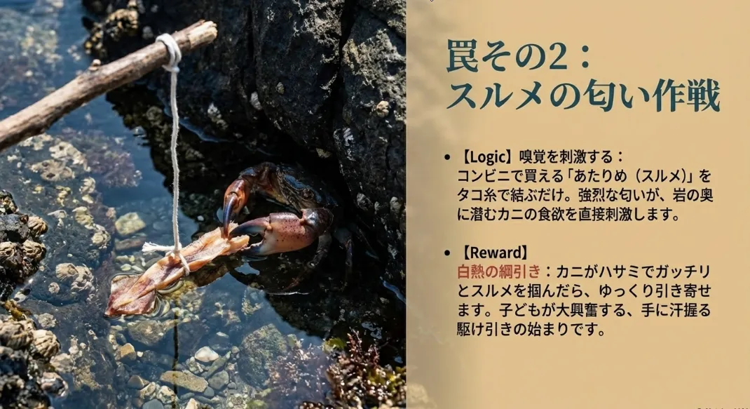 生き物の「匂いへの反応」や「逃げ道」を計算した罠なら、子供の力でも驚くほど獲れます。正しい道具選びと、法律を守るちょっとしたコツさえ知れば、磯は最高のアスレチックになりますよ。