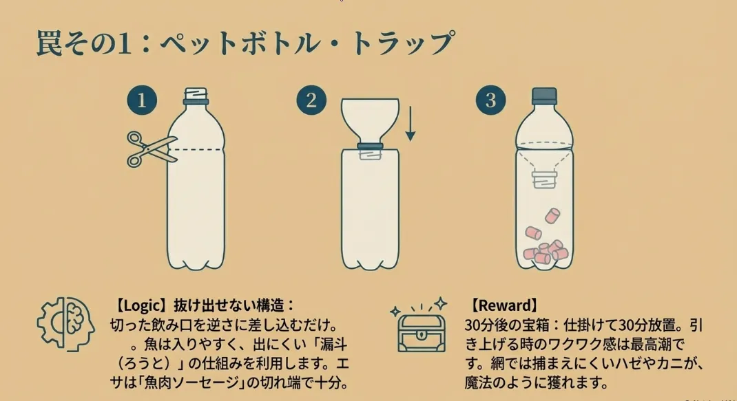 網を振り回してもシュッと逃げてしまうアゴハゼやドロメ、透明で隠れるのが上手なエビたちが、ボトルの底でピチピチ跳ねている姿を見た時の子供の興奮は最高です。自分で作った仕掛けに生き物が入るという「発明家」のような達成感も味わえます。ただし、このタイプは地域によって「かご漁具」とみなされることがあるので、設置したままその場を離れないようにしてくださいね [cite: 1]。