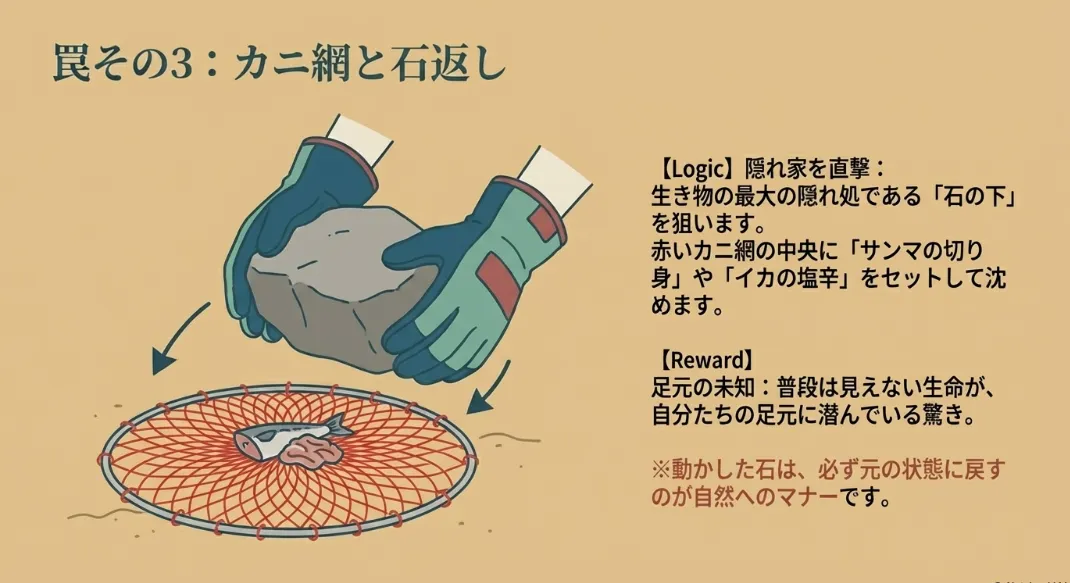 「罠」と言っても、大掛かりな仕掛けや高価な道具は必要ありません。身近にあるものや、ちょっとした網の使い方を工夫するだけで、潮溜まり(タイドプール)は宝の山に変わります。大切なのは、生き物たちの目線に立って「どうすれば安心して入ってきてくれるかな?」と親子で考えること。