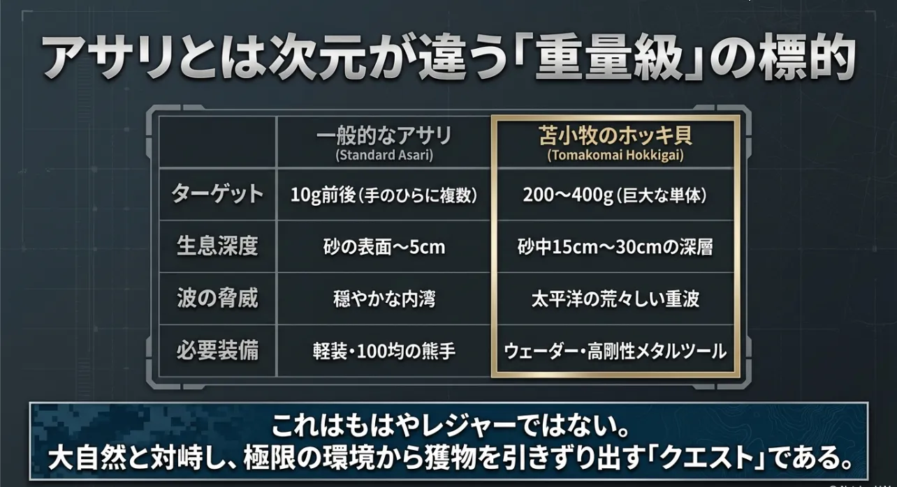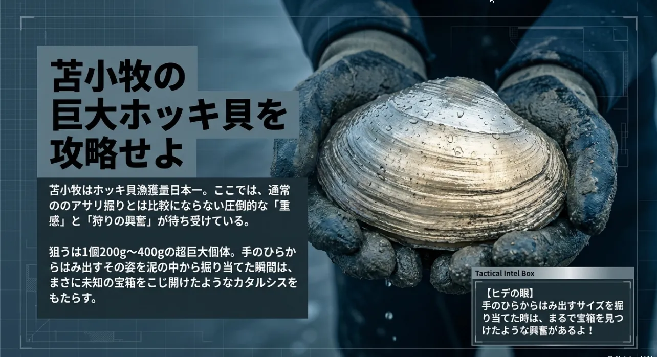 日本一の漁獲量を誇る苫小牧のホッキ貝は、サイズも手応えも規格外です。ただし、太平洋の荒波や冷たい海水、そして砂の深さといった「壁」があるのも事実。今回は、海の厳しさと豊かさを知る僕が、初心者パパ・ママでも巨大なホッキ貝を確実に手にするための攻略法を徹底的に伝授しますね。