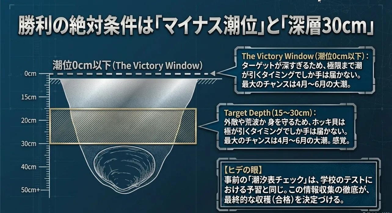 ホッキ貝を狙うなら、タイミングが全てです。ベストシーズンは4月から6月にかけての「大潮」の日。特に、潮位が0cm以下(マイナス潮位)になる時間帯を狙い撃ちするのが鉄則です。普段は深い海の中に沈んでいるホッキ貝の生息エリアが、このタイミングだけは私たちの手が届く浅瀬になってくれるからです。