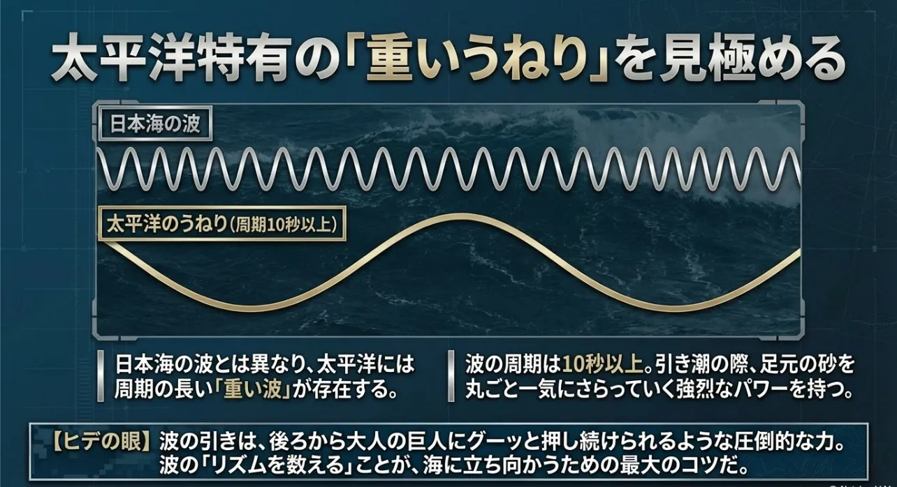 僕も若い頃、太平洋の引き波の強さをナメていて、足元の砂を一気に持っていかれて冷や汗をかいたことがあるんだ。太平洋の波は、背中をグーッと力強く押し続けられるような重さがある。特に子供を連れている時は、パパが波の周期をしっかり数えて「今は下がるぞ!」って声をかけてあげてほしいな。