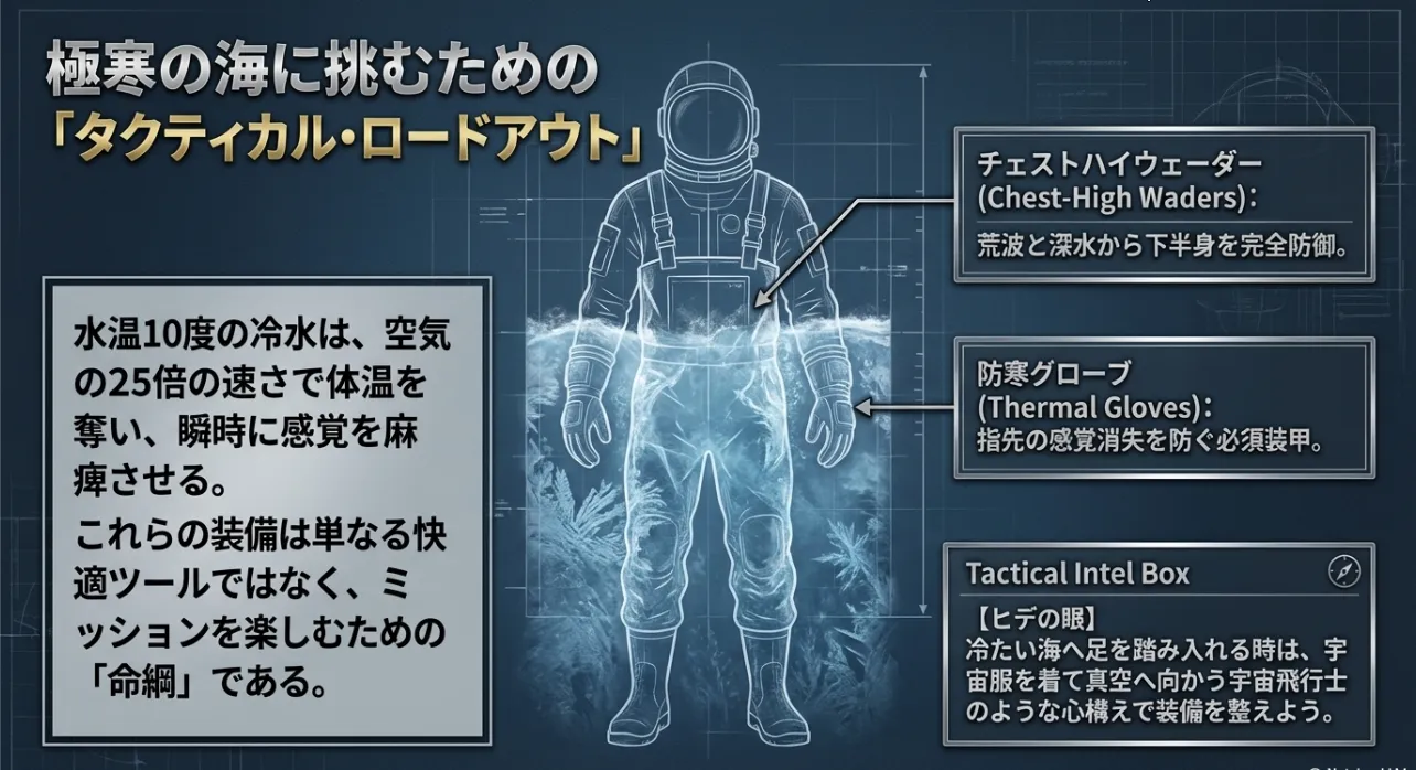 僕も経験があるのですが、海に入っている時はアドレナリンが出ていて寒さに気づきにくいんです。でも、陸に上がった瞬間にガタガタと震えが止まらなくなる。そうならないためには、後で紹介するウェーダーの中に、しっかりとした防寒インナーを着込むことが不可欠ですよ。