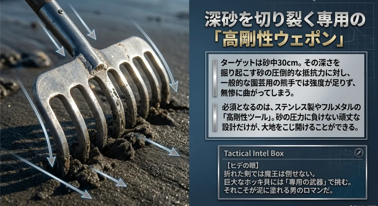 そのため、安価な園芸用の熊手では爪が曲がってしまい、勝負になりません。砂の強い抵抗に耐えられる、剛性の高い「ステンレス製」や「フルメタル」の熊手を用意することが、収穫への最短距離になります。アサリとホッキ貝の違いを簡単に表にまとめたので、ターゲットの特性を理解しておきましょう。