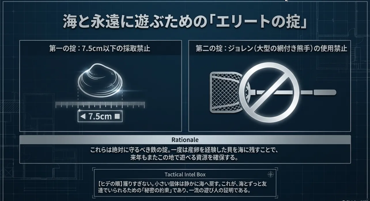 10秒に一度来る「重いうねり」が引く瞬間に、砂が一緒に動きます。その力を借りて熊手を入れると、深い層まで一気に攻略できます。 - その③ 生存デッドライン:7.5cm以下は即リリース&ジョレン禁止
