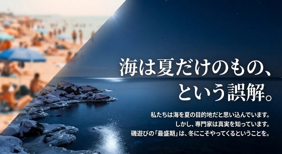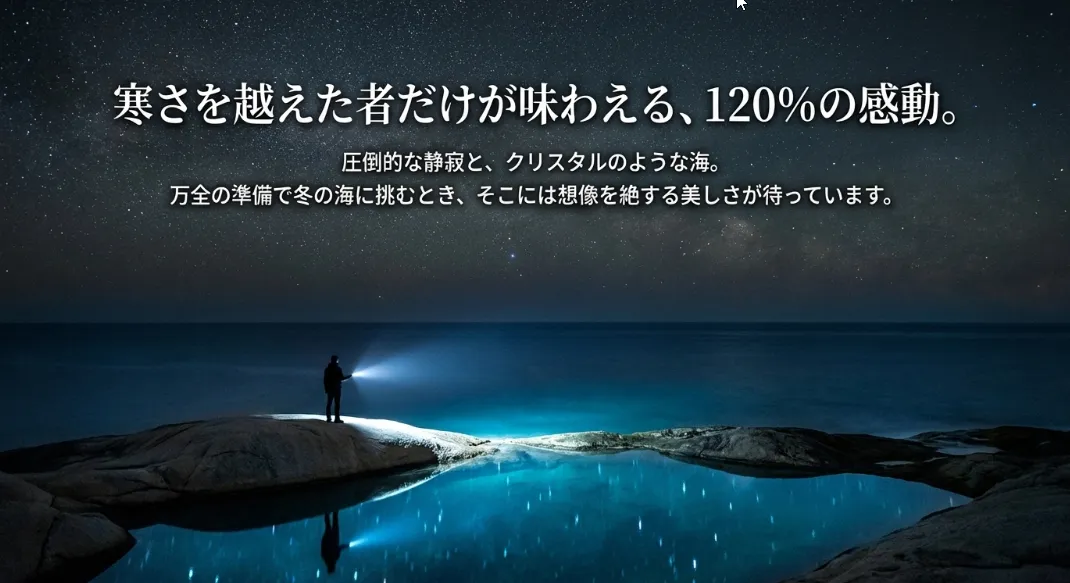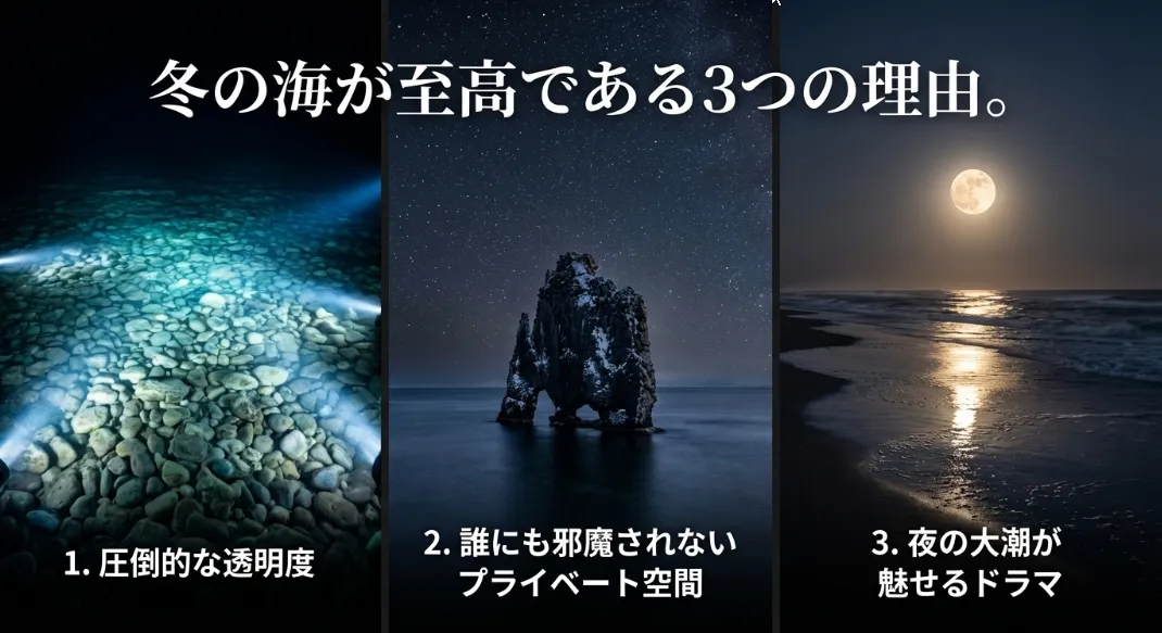冬は昼間ではなく夜に大きく潮が引く季節。完璧な防寒装備で「真夜中の干潮」を狙えば、夏を遥かに凌ぐクリスタルクリアな絶景と、冬限定の希少生物に出会えます。