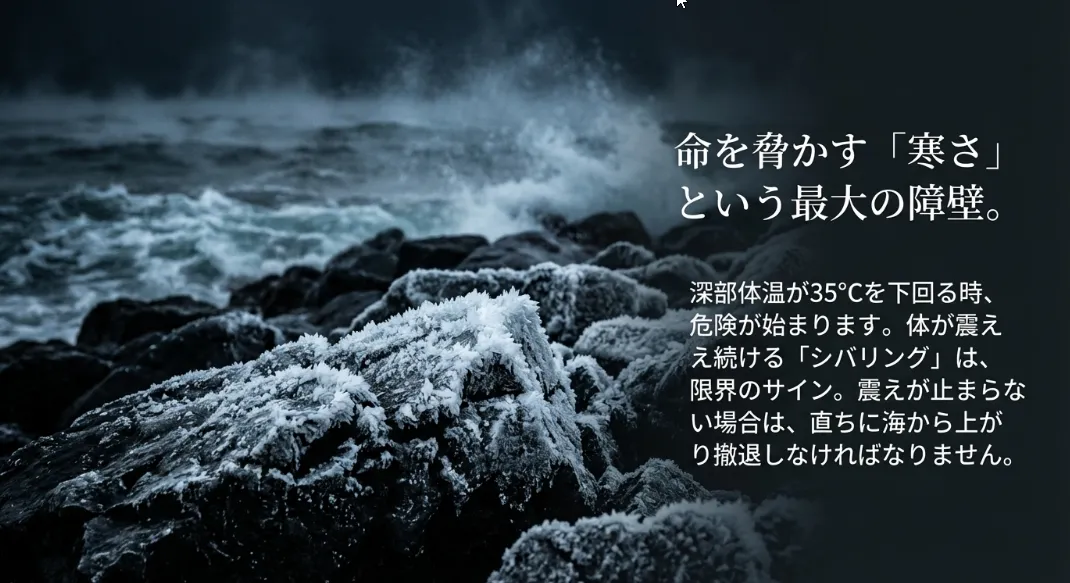 冬の海で最も警戒すべきは「低体温症」です。専門機関によると、体温が35℃を下回ると筋肉が激しく震える「シバリング」が発生します。もし、この震えが止まったら、それは回復ではなく、体が熱を作るエネルギーを使い果たした非常に危険なサインです 。この段階で無理を続けるのは絶対に禁物です。