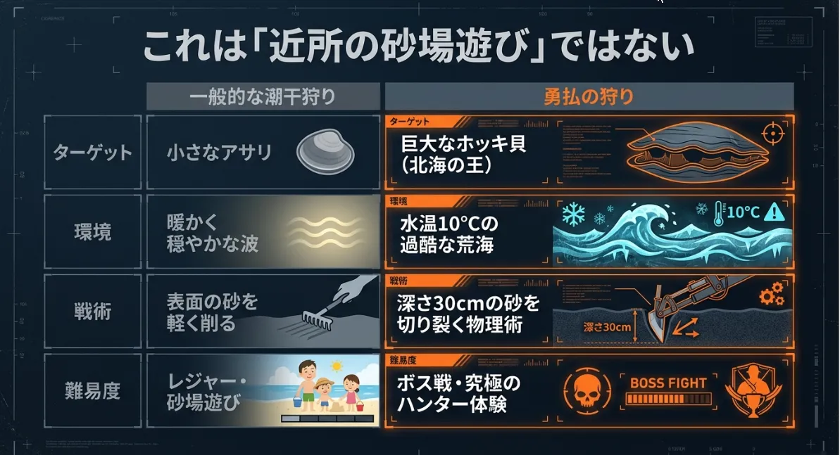 勇払の潮干狩りは、公園の砂場で遊ぶようなレジャーとは一線を画します。親潮の冷たい海水に耐え、重く締まった砂をハックし、水深30cm以上に潜む大型貝を引きずり出す。それはまさに、大自然との知恵比べであり、体力勝負の「狩り」そのもの。今回は、中学生以上のお子さんと一緒に本気で挑みたいお父さん・お母さんのために、勇払のホッキ貝を確実に手中に収めるためのロジックと装備を伝授します。