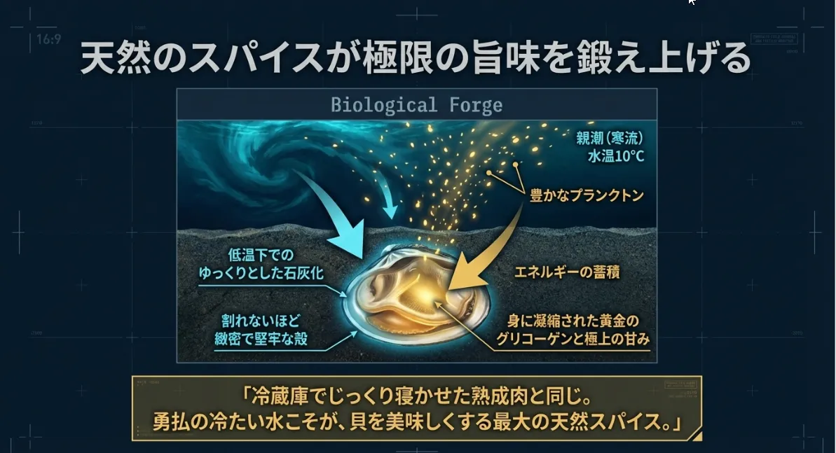 勇払の海は、初夏でも海霧(移流霧)が発生するほど水温が上がりません。この冷水環境下では、貝の成長速度はゆっくりになります。しかし、その分だけ貝殻の結晶構造が緻密になり、身にはエネルギー源である「グリコーゲン」が蓄えられます。これが、勇払産ホッキ貝の「割れないほど硬い殻」と「濃厚な甘み」の正体。厳しい冬を越えるための生存戦略が、僕たちに最高の恩恵を届けてくれるわけです。