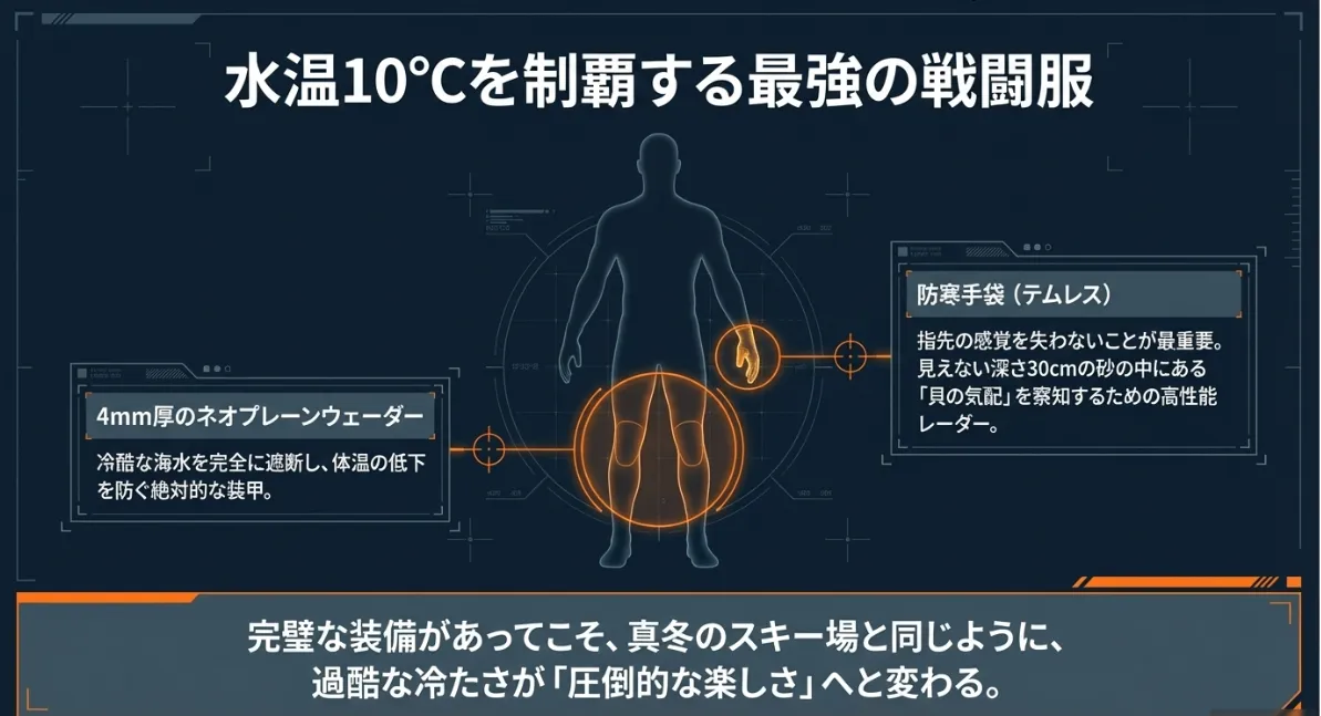 あわせて読みたい:4月の潮干狩りは寒い!水温ラグをハックするプロの防寒装備術