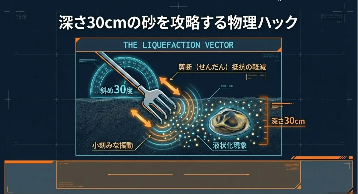大型貝を深層から効率よく掘り出すための、物理的な熊手操作術を詳しく解説しています。